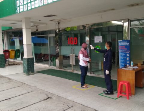 Kegiatan pembersihan/sterilisasi alat dan ruangan dengan desinfektan dan program pengecekan suhu tubuh kepada karyawan dan pengunjung RS Sukmul Sisma Medika.