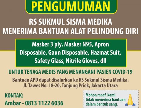 Pengumuman !! Kami dari RS Sukmul Sisma Medika menerima bantuan APD (Alat Pelindung Diri) berupa Masker 3ply Masker N95 Apron Disposable Gaun Disposable Hazmat Suit Safety Glass Nitrive Gloves dll Bantuan dapat disalurkan ke RS Sukmul Sisma Medika dengan alamat tertera dan dapat menghubungi nomor tercantum.