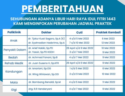 Pemberitahuan Jadwal Dokter Cuti Idul Fitri 1443H. Rumah Sakit Sukmul Sisma Medika Jl. Tawes No.18, RT.5/RW.8, Tj. Priok, Kec. Koja, Kota Jkt Utara, Daerah Khusus Ibukota Jakarta 14220 021-430 1269 Website : sukmulsismamedika.com Sosial Media : Facebook Instagram
